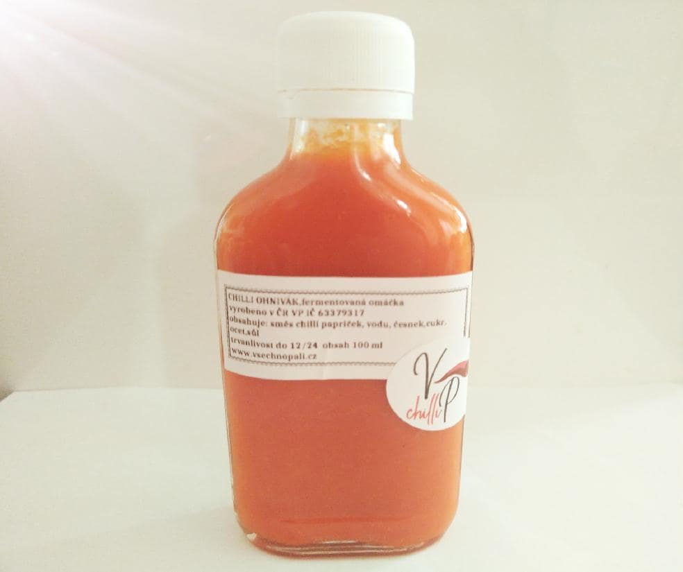 Fermentovaná omáčka z chilli papriček obsahuje vodu, chilli papričky, cukr, sůl, česnek, ocet mírně až středně pálivá